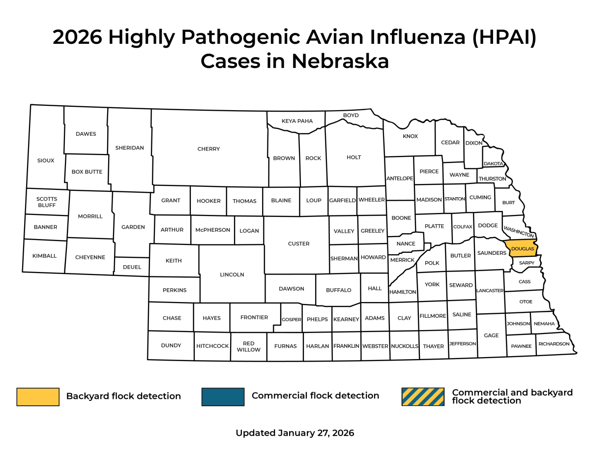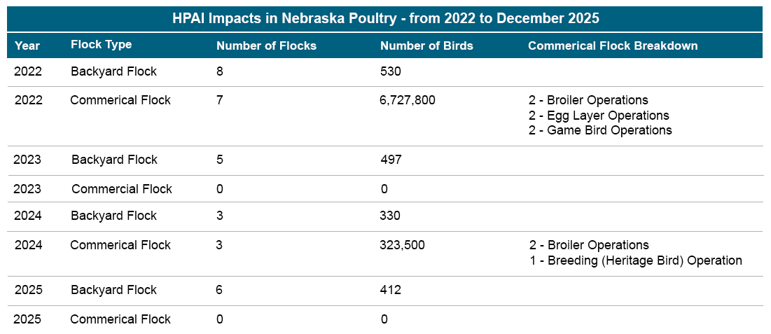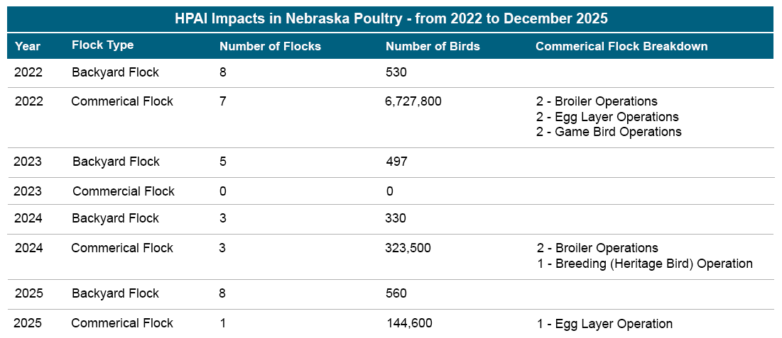 - Genome Sequencing has determined that all poultry HPAI cases in Nebraska have been from wildlife introductions. Therefore, the Nebraska Department of Agriculture encourages poultry producers to practice good biosecurity with their flocks including minimizing exposure to wild birds and washing your hands as well as changing your clothes (including shoes) before and after coming into contact with poultry.