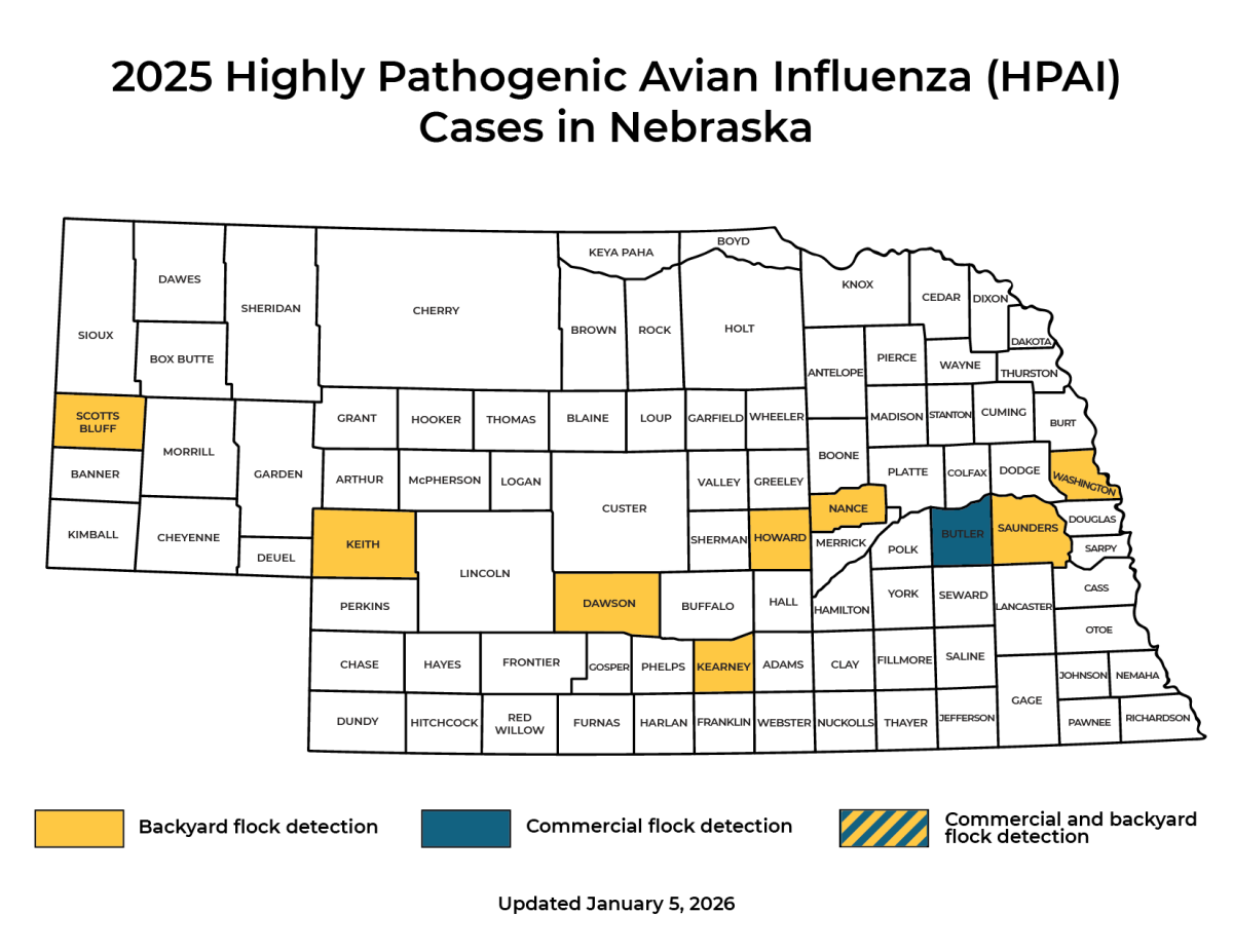 - Genome Sequencing has determined that all poultry HPAI cases in Nebraska have been from wildlife introductions. Therefore, the Nebraska Department of Agriculture encourages poultry producers to practice good biosecurity with their flocks including minimizing exposure to wild birds and washing your hands as well as changing your clothes (including shoes) before and after coming into contact with poultry.