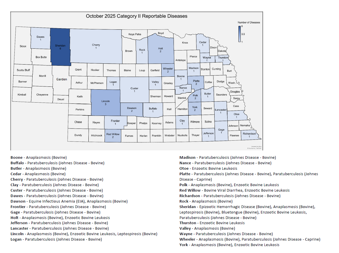 Nebraska Reportable DiseaseNebraska Reportable Disease - Year to Date - 2025Nebraska Reportable Disease - Previous Year - 2024Reporting FormDisease ListLivestock Reportable Disease Regulations2025October September August July June May April March February January 2024DecemberNovemberOctoberSeptemberAugustJulyJuneMayAprilMarchFebruaryJanuary2023DecemberNovemberOctoberSeptemberAugustJulyJuneMayAprilMarchFebruaryJanuary2022DecemberNovemberOctoberSeptemberAugustJulyJuneMayAprilMarchFebruaryJanuary2021DecemberNovemberOctoberSeptember